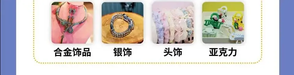 饰品成品:头饰、项链、手链、胸针、珠宝、合金饰品、铜饰品、银饰、钢饰盒等;
