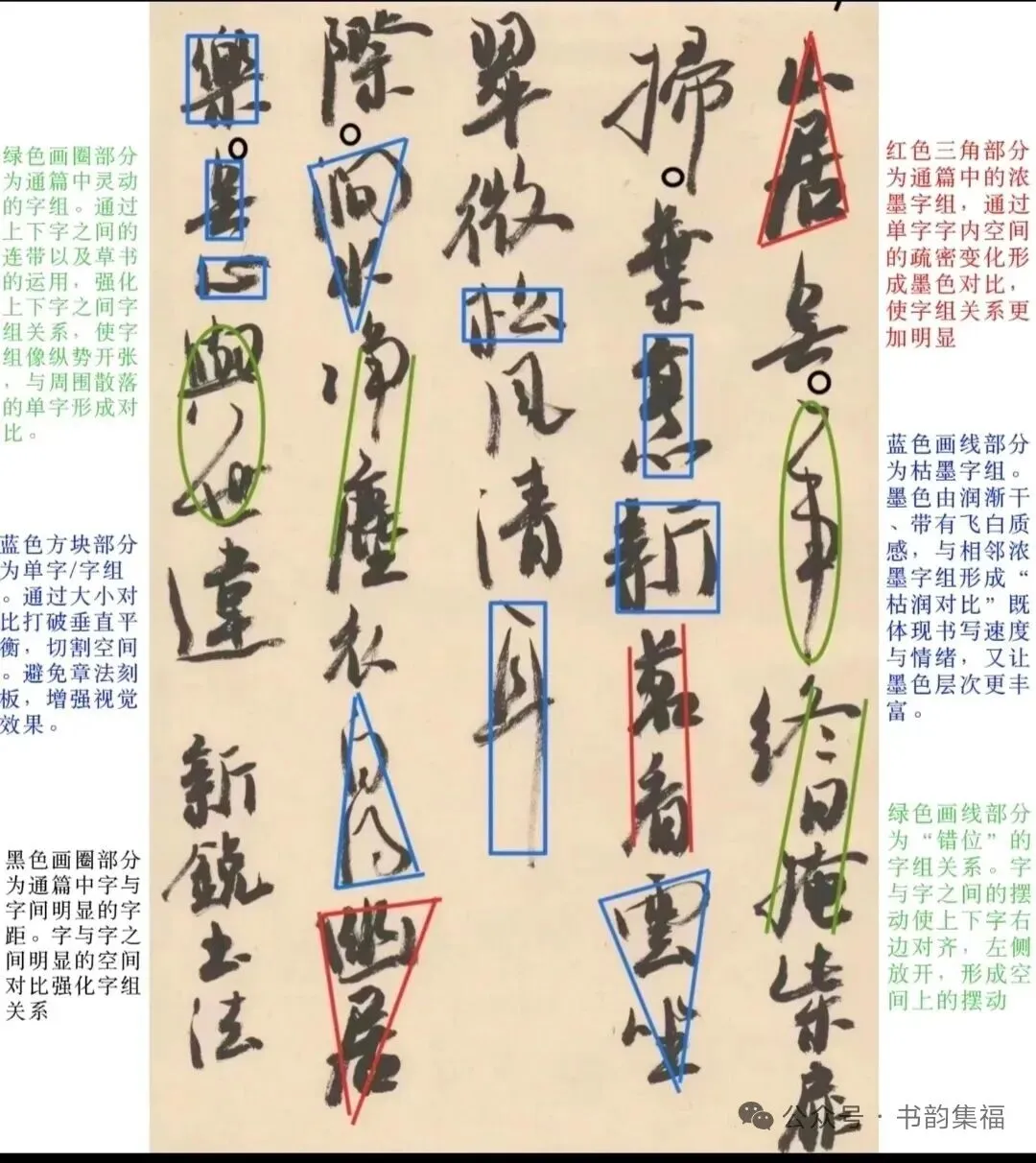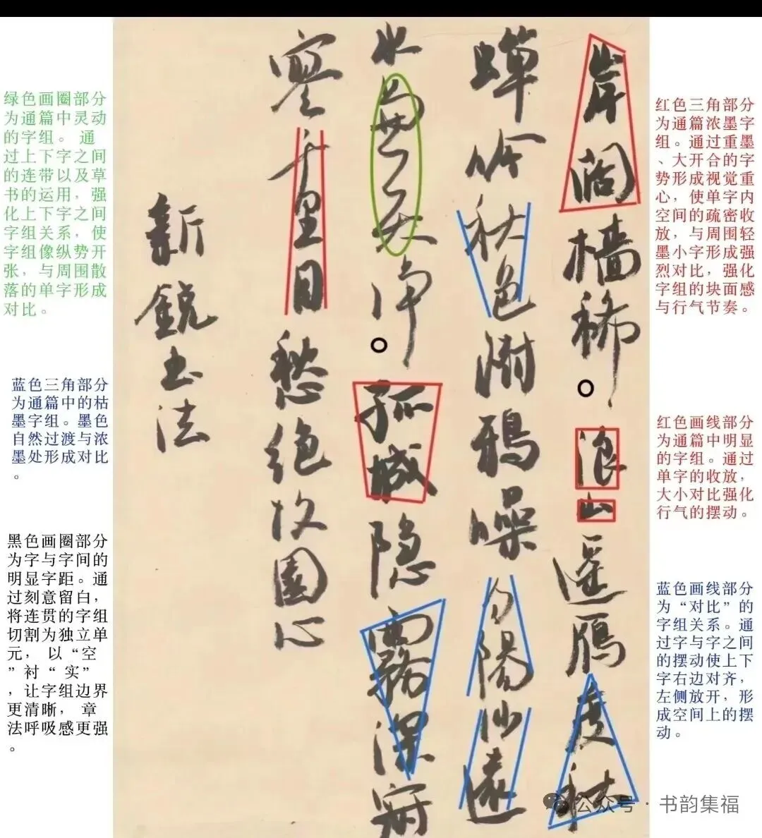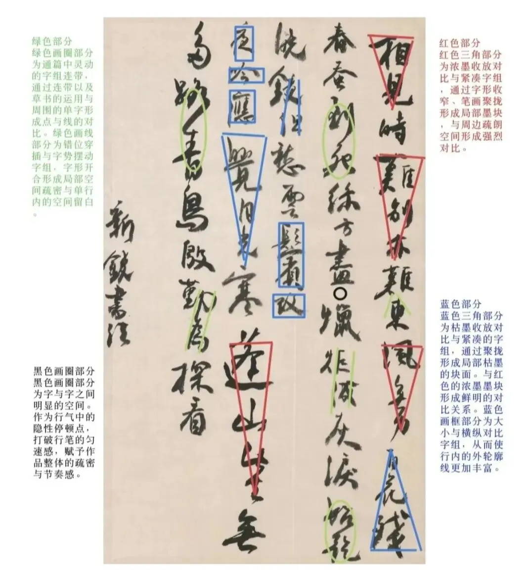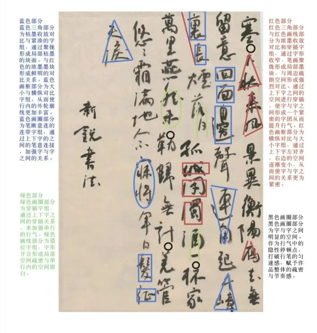 我所编著的《颜真卿诗词创作解析》一书,正是试图将这些行之有效的展览创作方法进行系统梳理与直观呈现。书中摒弃空泛理论,直接在高清原作图版上进行标注解析。红色标识指引你如何构建块面以稳定全局气势;蓝色线条锁定枯笔飞白的关键节奏点;绿色脉络则梳理那些错落穿插、带动行气的字组关联。本质上,这是将职业书家心照不宣的参展策略与形式规律,转化为清晰可视的视觉语言。