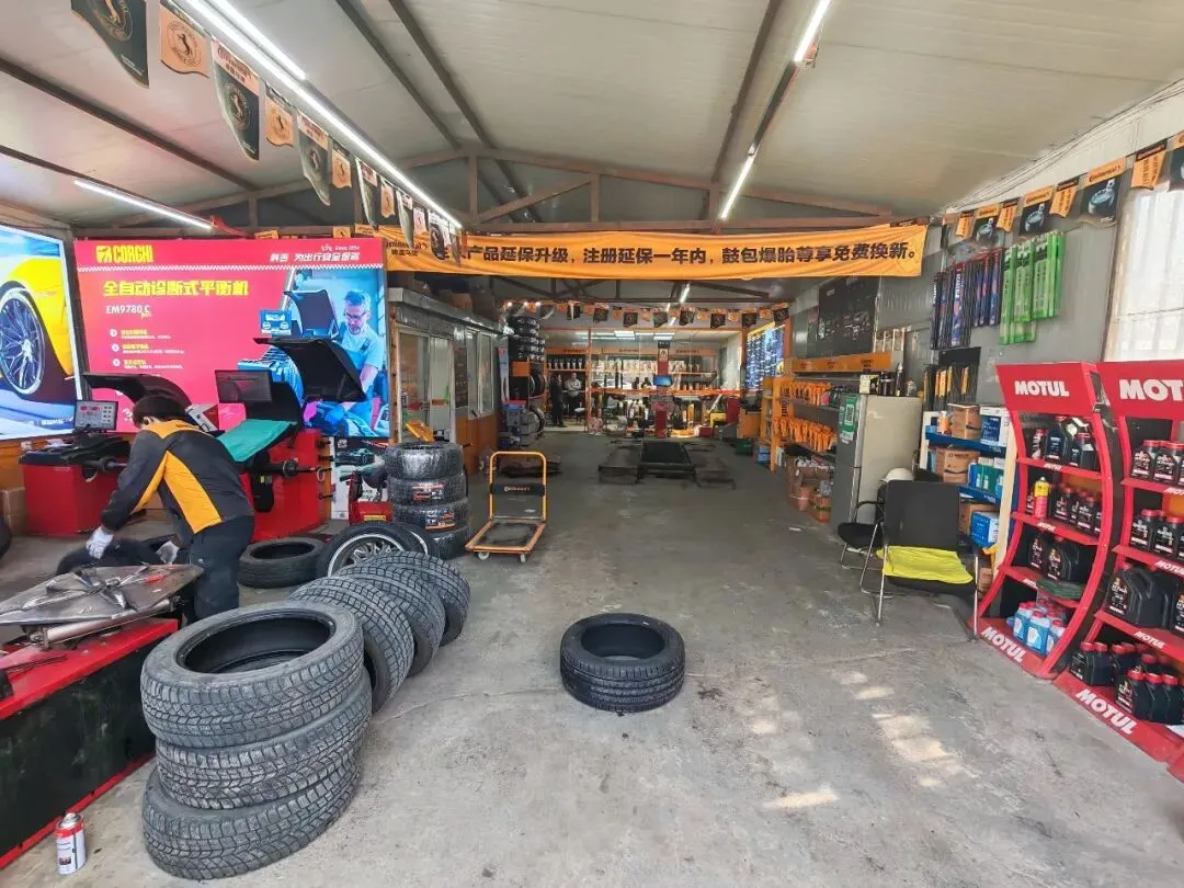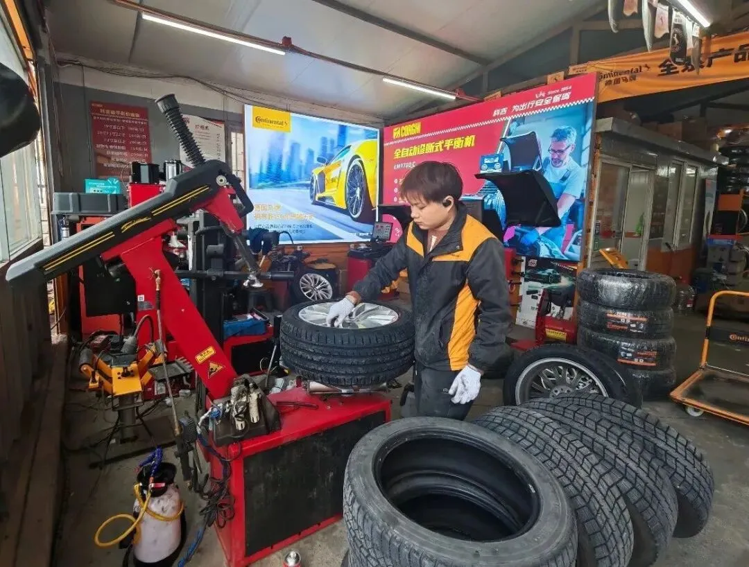 维修车间里,专业技师正有条不紊进行轮胎拆装、动平衡、四轮定位等操作,标准化作业流程规范有序。