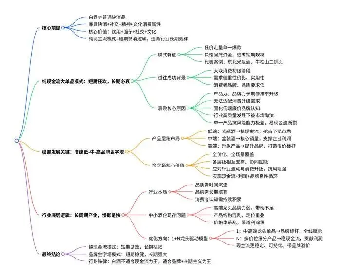 内容提要:本文分析白酒行业不适用于“现金流为王”纯单品模式的核心原因,指出该模式短期能回笼资金却忽视产品与品牌升级,难以适应消费变化与行业高质量发展,易陷入衰退。通过对比中小酒企,强调白酒作为长周期社交型产业,需搭建“低-中-高”品牌金字塔,坚持长期品牌战略,才能实现稳定高质量增长。很多初入白酒行业乃至于深耕多年的酒企或品牌方,都习惯于将其他行业的运营认知直接套用在传统白酒生意上,其中最具代表性的就是所谓“现金流为王”的纯单品业务模式。这种模式的核心逻辑是,通过打造一款低价、走量的大单品,快速抢占市场、回笼资金,实现短期规模扩张。但在实际经营中,即便这类大单品能在短期内实现爆发式增长,其生命力往往难以持久——东北光瓶酒就是最为典型的案例,而类似的困境远不止于此,曾经风靡全国的牛栏山二锅头,如今也步入了衰退阶段,营收下滑、利润承压成为常态。为什么这种在其他行业看似“万能”的“现金流”业务,在传统白酒行业却走不远?今天,我结合行业实践与观察,谈谈自己的看法,也欢迎行业同仁留言交流、共同探讨。在深入分析之前,我们先明确一个核心前提:传统白酒行业绝非简单的“快消品行业”,它兼具快消属性与精神消费、社交消费属性,其核心价值不仅在于产品本身的饮用功能,更在于背后承载的面子价值、社交价值与文化价值。而“现金流为王”的纯单品模式,本质上是一种“短期利益导向”的快消逻辑,它只关注资金的快速周转,却忽略了白酒行业的核心规律与长期发展需求,这也是其难以持久的根本原因。一、纯现金流大单品的弊端:短期狂欢,长期必衰