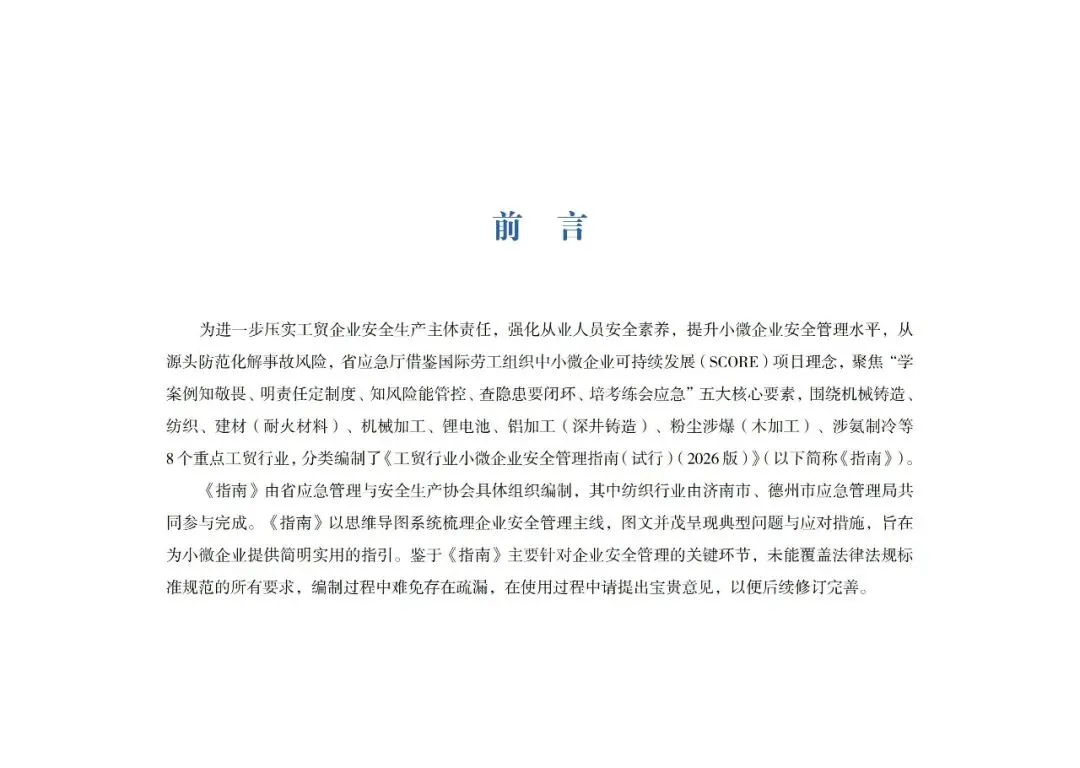 为进一步压实工贸企业安全生产主体责任,强化从业人员安全素养,提升小微企业安全管理水平,从源头防范化解事故风险,省应急厅借鉴国际劳工组织中小微企业可持续发展(SCORE)项目理念,聚焦“学案例知敬畏、明责任定制度、知风险能管控、查隐患要闭环、培考练会应急”五大核心要素,围绕机械铸造、纺织、建材(耐火材料)、机械加工、锂电池、铝加工(深井铸造)、粉尘涉爆(木加工)、涉氨制冷等8个重点工贸行业,分类编制了《工贸行业小微企业安全管理指南(试行)(2026 版)》(以下简称《指南》)。