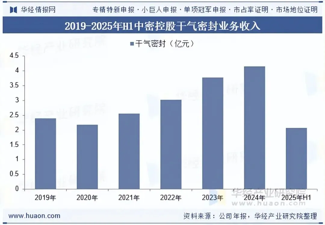 2024年,中密控股典型大项目方面,公司配套北方华锦项目 70 万吨/年苯乙烯装置尾气压缩机静压干气密封,静压干气密封再添业绩,配套北方华锦项目上千台离心泵包括加氢装置、芳烃装置大轴径波纹管密封等产品。2025年上半年中密控股干气密封业务收入约为2.08亿元。