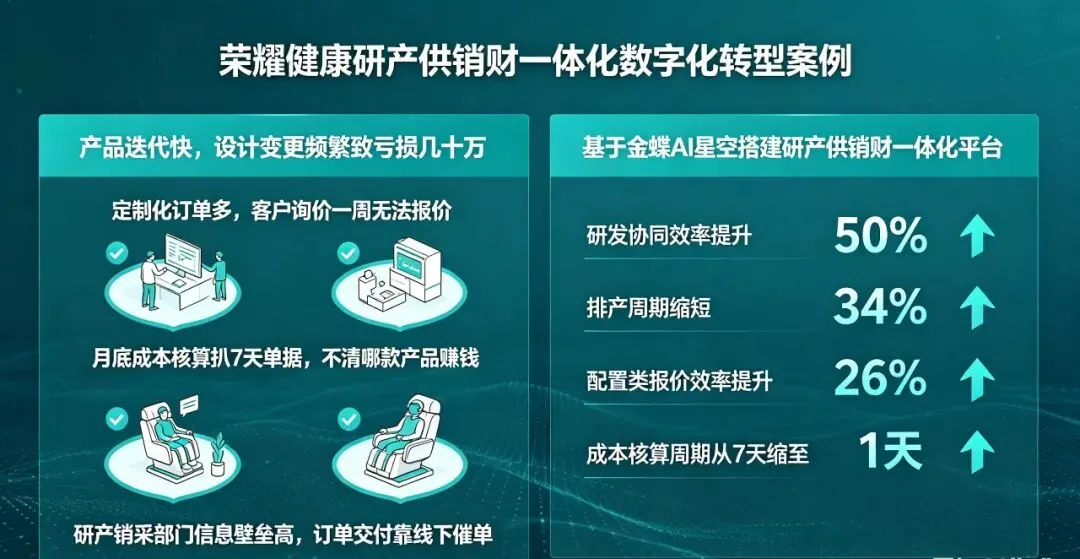 这些行业共性难题,也是福建荣耀健康科技股份有限公司(以下简称 “荣耀健康”)在规模扩张中直面的核心挑战。作为福建省按摩器具行业的领军企业、新三板挂牌企业,荣耀健康深耕智慧健康产业多年,年产按摩椅可达 30 万台,却在多组织战略落地时,被老旧系统拖了后腿 —— 研产供销业务全线断层,运营效率遭遇瓶颈。最终,荣耀健康携手蝶普科技,基于金蝶 AI 星空搭建了研产供销财一体化数字化平台,不仅破解了长期的管理顽疾,更实现了核心运营指标的跨越式提升:研发协同效率提升 50%,排产周期缩短 34%,配置类报价效率提升 26%,成本核算周期从 7 天缩短至 1 天,真正以数智之力,打开了企业高质量发展的全新纪元。