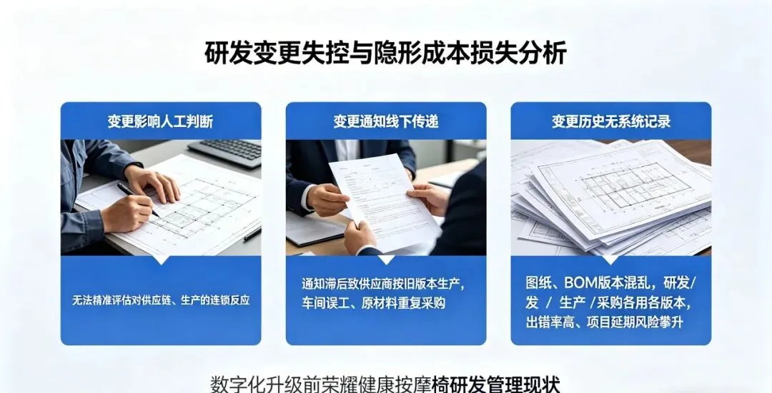 按摩椅产品迭代速度极快,为匹配市场需求和客户定制化要求,企业在设计阶段需要频繁调整变更。但数字化升级前,荣耀健康的设计变更管理完全处于 “失控” 状态:变更影响全靠人工判断,根本无法精准评估一次设计调整会给供应链、生产制造带来哪些连锁反应;变更通知全靠线下传递,经常出现通知滞后的情况,尤其是涉及供应商定制的零部件,往往图纸改了,供应商还在按旧版本生产,最终造成车间误工、原材料重复采购,大量隐形成本白白流失;更严重的是,变更历史没有系统化记录管理,图纸、BOM 版本混乱,研发、生产、采购各用各的版本,出错率居高不下,研发项目延期风险持续攀升。