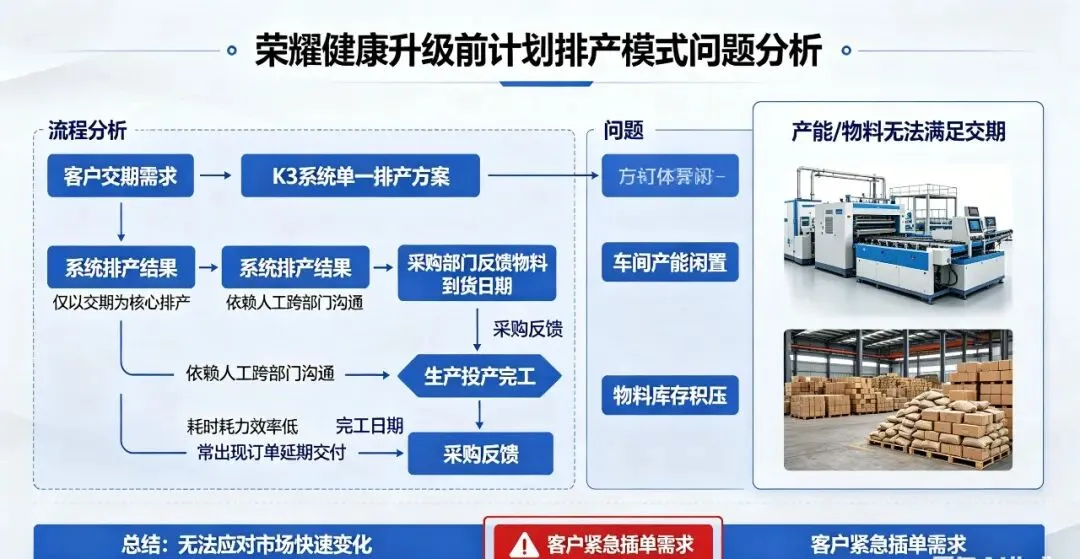 升级前,荣耀健康在原有 K3 系统中只能采用单一的计划排产方案,完全以客户交期为核心排产。哪怕现有产能、物料供应根本无法满足客户指定交期,系统也只能硬着头皮按交期排产,后续只能等采购部门反馈物料到货日期,等生产投产完工后,再把实际完工日期反写回订单交期。整个过程全靠人工跨部门沟通协调,耗时耗力,排产效率极低,不仅经常出现订单延期交付的情况,还会造成车间产能闲置、物料库存积压的双重浪费,完全无法应对市场快速变化和客户紧急插单需求。