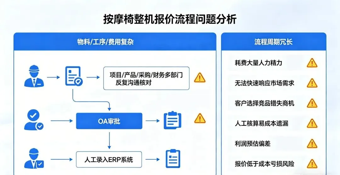 按摩椅属于定制化程度较高的产品,整机报价涉及的物料、工序、费用极其复杂。新品核价、客户定制报价,需要项目、产品、采购、财务等多个部门反复沟通核对,最终通过 OA 审批后,再由人工把价格录入 ERP 系统。整个流程周期冗长,不仅耗费大量人力精力,更关键的是无法快速响应市场需求和客户询价,经常出现报价还没出来,客户已经选择了竞品的情况,白白错失大量市场商机。同时,人工核算报价极易出现成本核算遗漏、利润预估偏差的问题,甚至会出现报价低于实际成本的亏损风险。