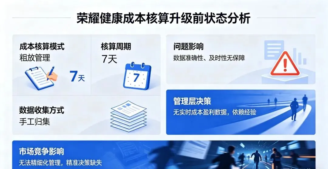 升级前,荣耀健康的成本核算完全处于粗放管理状态,成本核算周期长达 7 天。每个月财务部门都要耗费大量时间,从各个部门收集单据、手工归集成本、分摊费用,不仅工作量巨大,核算数据的准确性、及时性都无法保障。企业管理层根本无法实时掌握每个产品、每个订单的实际成本和盈利情况,经营决策只能靠过往经验,而非精准的数据支撑,在日益激烈的市场竞争中,完全无法实现精细化管理和精准决策。