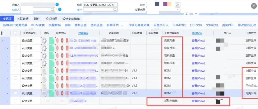在设计变更发起时,系统提供了强大的设计变更评估能力,以零部件为切入点,对变更对象进行全维度影响分析,员工可直接在系统中快速查询变更产品被哪些部件、哪些成品引用,精准定位变更的影响范围。更关键的是,基于 PLM 与 ERP 的深度一体化,系统可直接对变更涉及的采购申请单、采购订单、生产订单进行全链路影响评估,提前预判变更给采购、生产带来的影响,从根本上避免了误工、重复采购的问题。