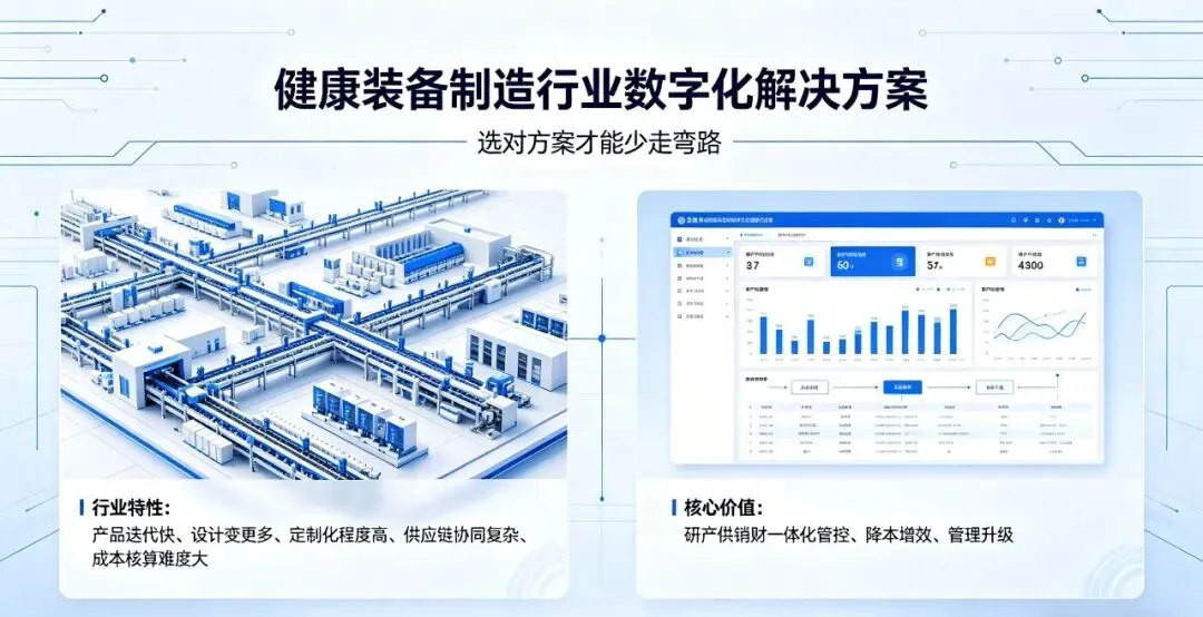 而健康装备制造行业普遍存在的产品迭代快、设计变更多、定制化程度高、供应链协同复杂、成本核算难度大的行业特性,决定了企业的数字化升级,不能只买一套软件,而是需要一套真正适配行业特性、解决企业核心痛点、匹配企业长期发展的一体化解决方案。