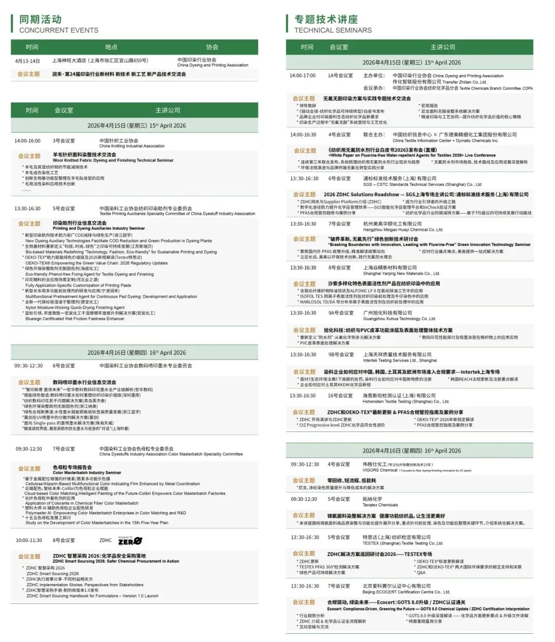 展会同期,中国印染行业协会、中国针织工业协会、中国染协助剂专委会、色母粒专委会、数码喷墨印花墨水专委会等行业协会将携同参展企业共举办近20场同期活动和专题技术讲座,内容涵盖各类创新技术工艺、前沿动态趋势、产品环保认证等内容,为更多专业观众提供绝佳的交流与合作机会。