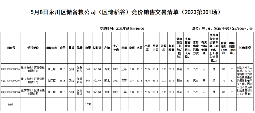 受重庆市永川区储备粮有限公司委托,重庆市粮油批发市场有限责任公司(即国家粮食重庆交易中心,以下简称“批发市场”)定于2023年5月8日10:00举办永川区储备粮公司(区储稻谷)竞价销售交易会,现将有关事项公告如下:1. 标的号:CQ23DG05080004—CQ23DG05080006。2. 产地、年限及数量:湖北2021年产优质稻谷1035吨。4. 标的质量:以交易清单质量指标为准。有意向参与交易的会员可通过“重庆粮网”(www.grainmarket.com.cn/centerweb/region/CQ)、“重庆粮食集团”官网(www.cqgrain.com)→资料下载→《竞价销售粮油看样单》路径,填写后加盖公章邮寄或扫描至批发市场,经批发市场审核盖章后,提前实地查看粮食实物质量和路况、出库条件等情况,确保所竞买的粮油符合自身使用用途,自主确定是否购买,并承担竞买后相应责任和市场风险。如未提前看样或看样后参与交易的,均视同认可标的质量,成交后不得再对质量提出异议。5. 本次交易清单附后。具体交易品种和数量等信息如有变化,以即时公告及交易清单为准。1. 报名资格:国内具有粮油生产、经营资格的企业或个人且在国家粮食交易平台注册的有效会员。2. 报名时间:2023年5月8日8:00前。报名参与交易即视作全面承认并遵守《重庆市地方政府储备竞价销售交易规则》和交易公告、交易清单等要求。1. 本次竞价交易使用国家粮食交易平台地储交易系统,2023年5月8日10:00通过网络对委托标的依次按交易节进行交易。请报名参加竞价交易的会员按时登录国家粮食交易中心官网(www.grainmarket.com.cn)→点击网页上方“请登录”或右方“用户中心”进行会员登录→点击“交易”板块→选择“重庆市场”→“ 5月8日重庆市地方储备粮(永川稻谷)竞价销售交易专场”。1. 保证金的收取和释放:参与竞价交易的买卖双方各须交纳保证金110元/吨(其中:履约保证金100元/吨和交易保证金10元/吨)。买方保证金须在竞价销售交易会开始前2个小时汇至批发市场指定银行账户;卖方保证金须在提交委托交易清单当日汇至批发市场指定银行账户。单笔合同交割完毕后,保证金释放。如合同部分交割,该合同数量的所有保证金处于冻结状态。2. 保证金转入:汇款时请备注“保证金”,待资金到账后,进入系统“用户中心”的资金界面,点击用户名称下方的“交易账户:明细”,将足额保证金“转入”重庆市场。3. 交易手续费:按成交金额的1.5‰向买方收取。1. 成交价格:为交易系统确认价格,即卖方承储库仓前散装车板交货价格,不含包装及整理费用,无出库费,无水、杂增扣量。如买方有包装以及整理要求,可与卖方协商,费用按照协商一致的标准另行结算。2. 合同签订:自成交之日起3个工作日内买卖双方在交易系统内签订电子购销合同或以邮寄、扫描等方式签订,如逾期未签订购销合同,则对违约方作违约处理。3. 付款及出库:买方自成交之日30天内付款完毕,30天内出库完毕。买方成交后将货款一次或分批汇入批发市场指定银行账户。出库前,买方在“我的合同”中点击“支付货款”来完成出库通知单申请。批发市场收到申请后,及时审核并开具《出库通知单》。4. 结算:出库完毕后买卖双方签订《验收确认单》,由卖方送达批发市场,批发市场在2个工作日内按《验收确认单》办理货款结算。2. 开户银行:中国农业银行股份有限公司重庆九龙坡中梁山支行 3. 账 号:31-0707010400088881. 本次交易规则详见“重庆粮网”(www.grainmarket.com.cn/centerweb/region/CQ)、“重庆粮食集团”官网(www.cqgrain.com)《重庆市地方政府储备竞价销售交易规则》,与此规则不一致的以本次公告为准。2. 会员在交易前到委托方存储库点看样或成交后到委托方存储库点提货时,需遵守当地的疫情防控政策,做好疫情防控工作。3. 本批次粮食出库后,买方不得将其作为政策性粮食重新销售给收粮单位入库,否则一切不良后果和法律责任均由买方承担。4. 各会员单位发现以陈顶新、转圈粮、套取财政补贴、人为设置障碍造成出库难、不执行出库质量检验制度等违法违规问题的,请拨打12325举报。5. 市场交易部联系电话:023-65269777 023-65269283▶ 网站 | www.grainmarket.com.cn/centerweb/region/CQ