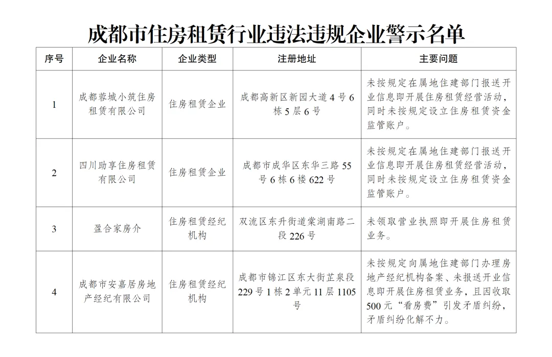 根据《住房租赁条例》相关规定,成都市、区两级住建主管部门持续开展住房租赁市场规范整治排查工作。3月下旬以来,新增查处4家存在违法违规行为的企业。