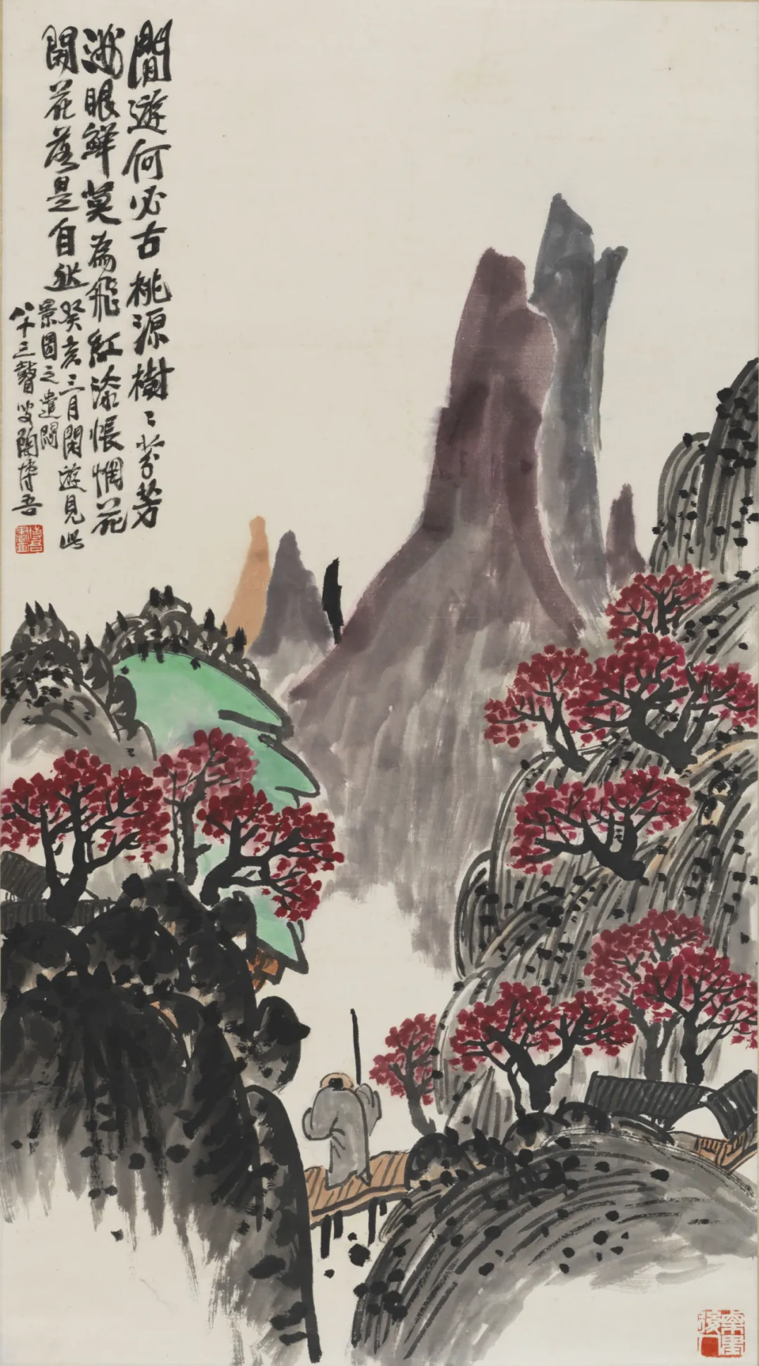 释文:闲游何必古桃源,树树芬芳满眼鲜。莫为飞红添怅惘,花开花落是自然。