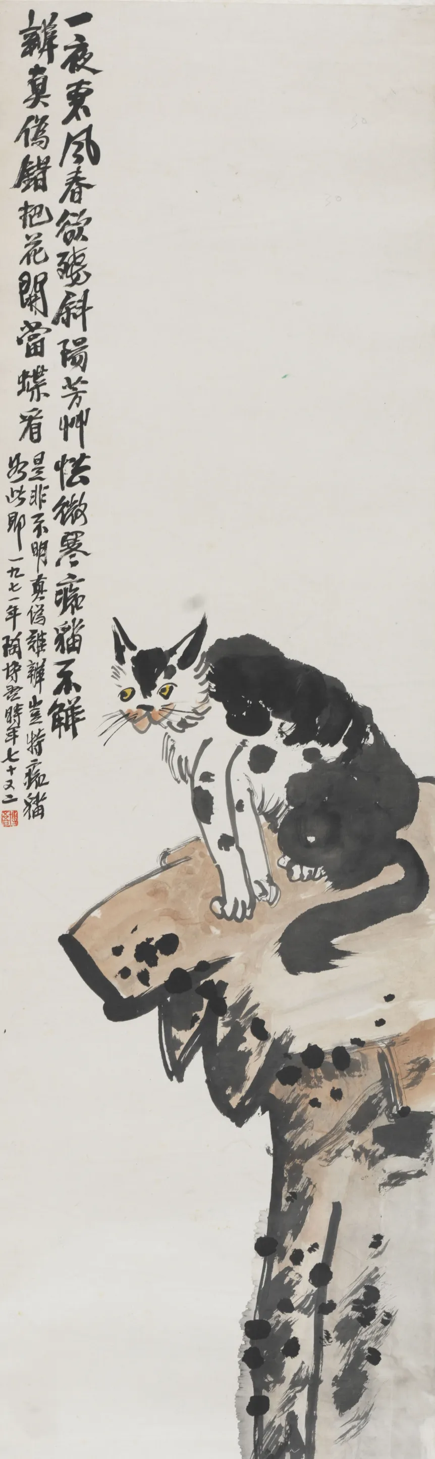释文:一夜东风春欲残,斜阳芳草怯微寒。痴猫不解辨真伪,错把花开当蝶看。