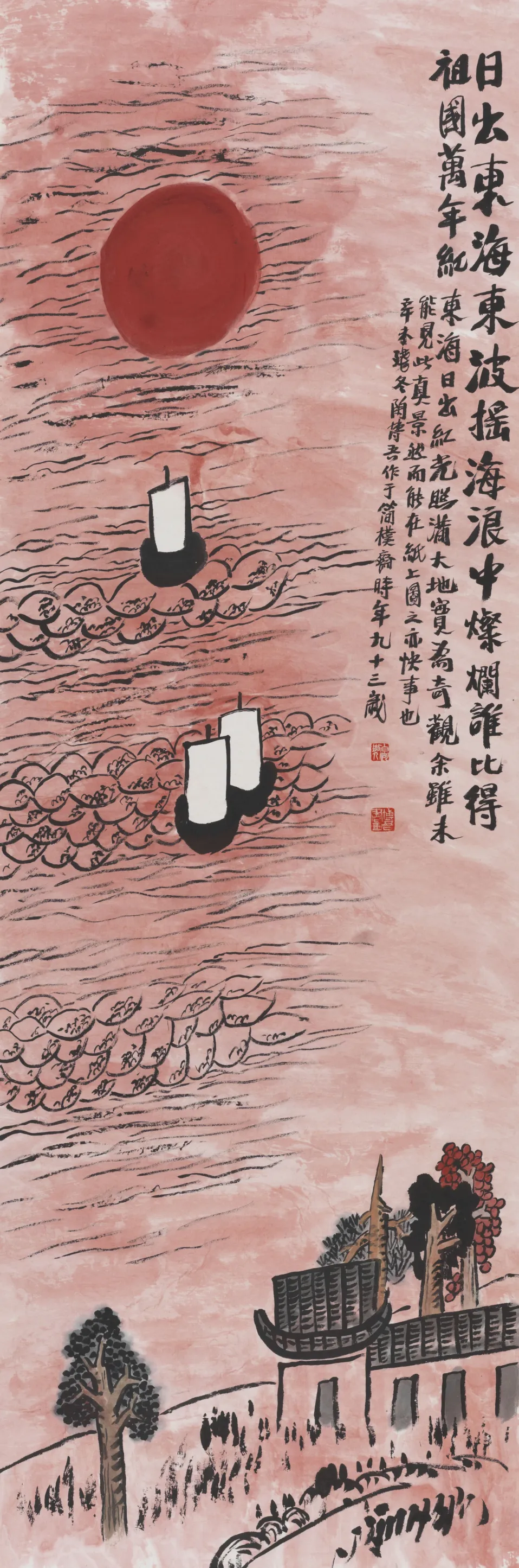 东海日出,红光照满大地,实为奇观。余虽未能见此真景,然而能在纸上图之,亦快事也。