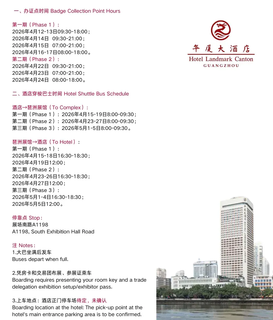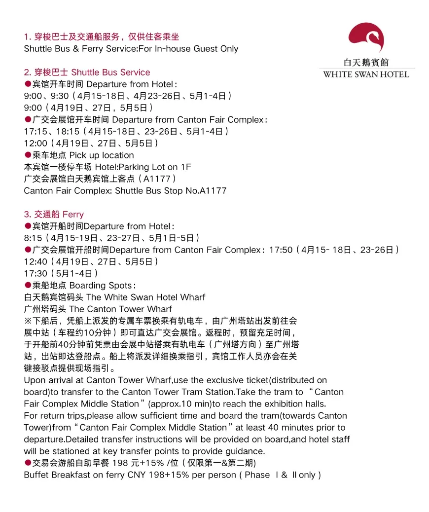 As the Official Accommodation Partner, White Swan Hotels operates 13 strategically located properties across Guangzhou’s CBD, providing global exhibitors and buyers with seamless business travel solutions — including premium accommodation, dining, transportation, and business services — to support successful cooperation and partnerships.