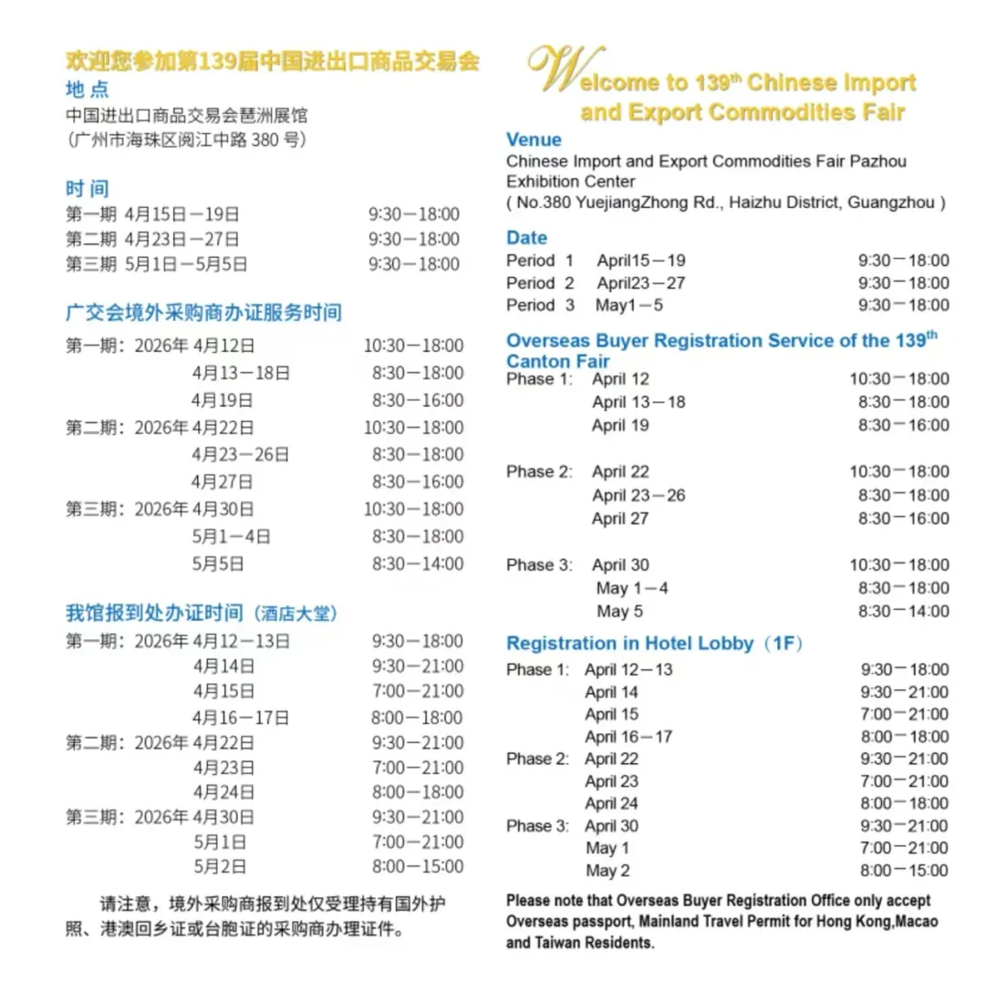 The 139th Canton Fair will be held at the Guangzhou Pazhou Complex from April 15 to May 5, 2026, with 54 exhibition zones spanning 178 specialized sectors.