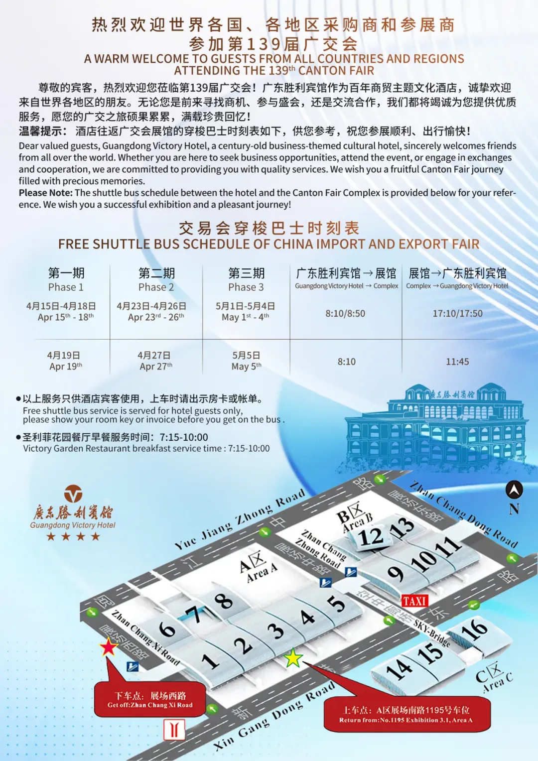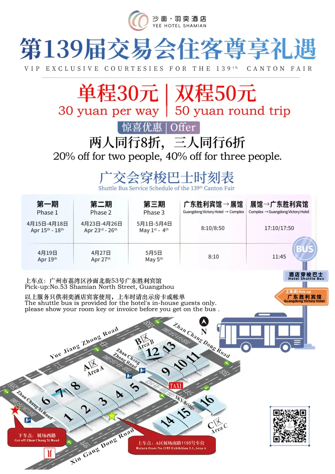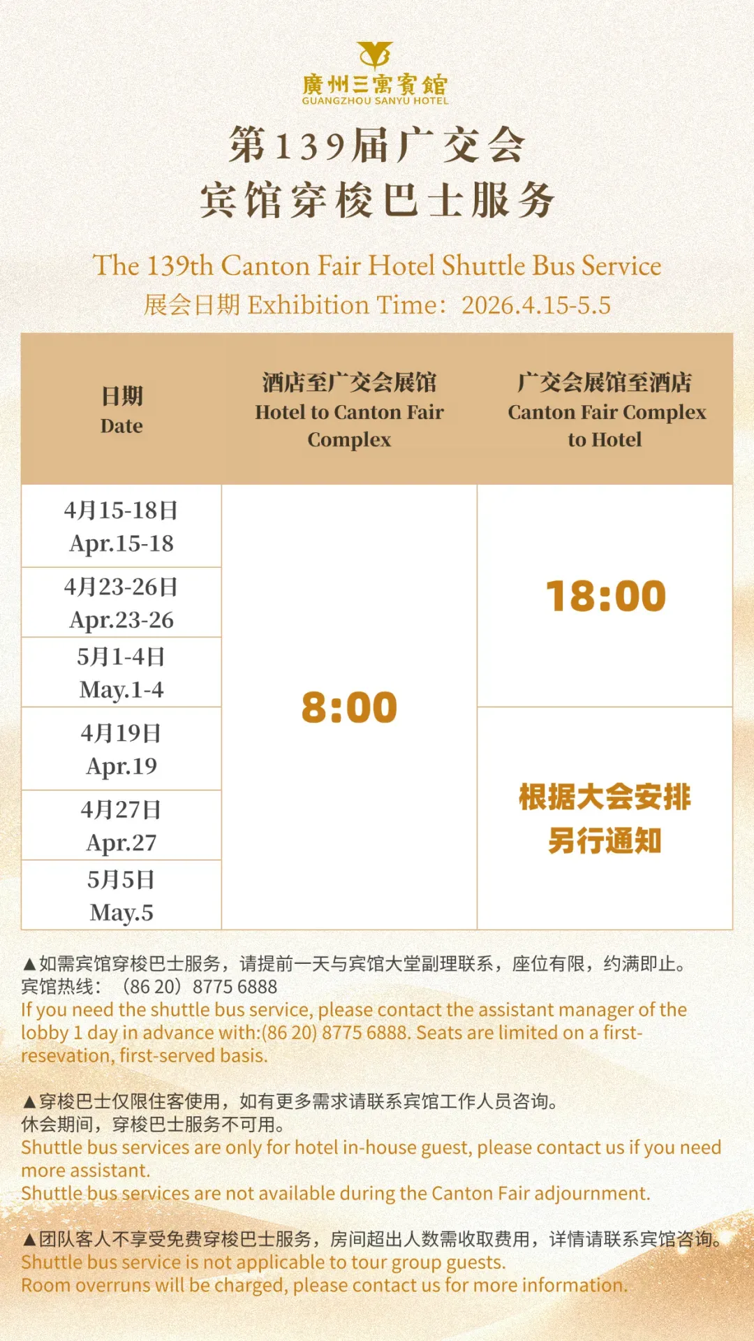 The 139th Canton Fair will take place at the Guangzhou Pazhou Complex from April 15 to May 5, 2026, featuring 54 exhibition zones and 178 specialized sectors. As the official accommodation partner, White Swan Hotels offers 13 strategically located properties across Guangzhou’s CBD, delivering global exhibitors and buyers seamless business travel solutions—covering premium accommodation, dining, transportation, and business services—to foster successful partnerships.