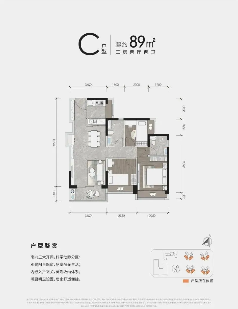 89㎡ 3房2厅2卫:三开间朝南,奢阔主卧套房
