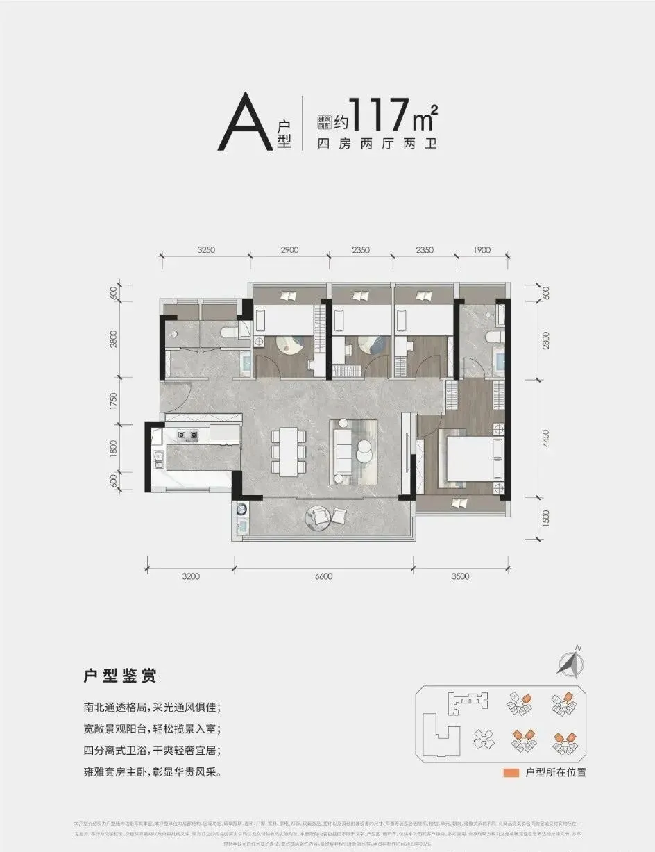 117㎡ 4房2厅2卫:稀缺南北通透、大横厅阔绰4房,约6.6米阔景阳台 ,四分离卫生间