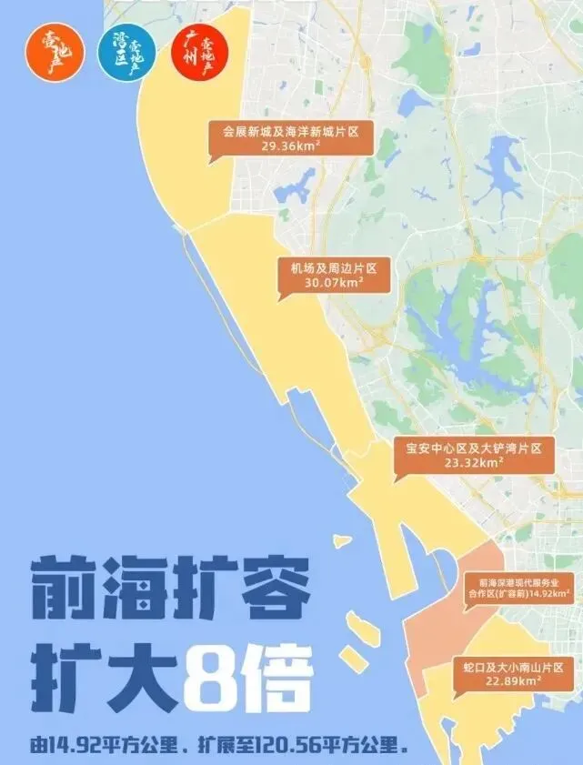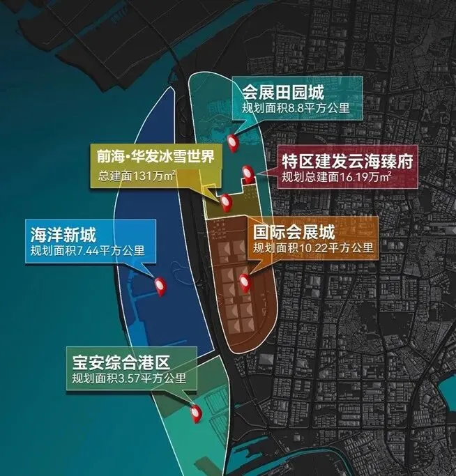 前海合作区扩大到约120.56平方公里,会展新城及海洋新城片区凭借双核规划优势,总投资超千亿元将直接撬动连通前海万亿规模经济带,将成为粤港澳大湾区新的经济增长极。