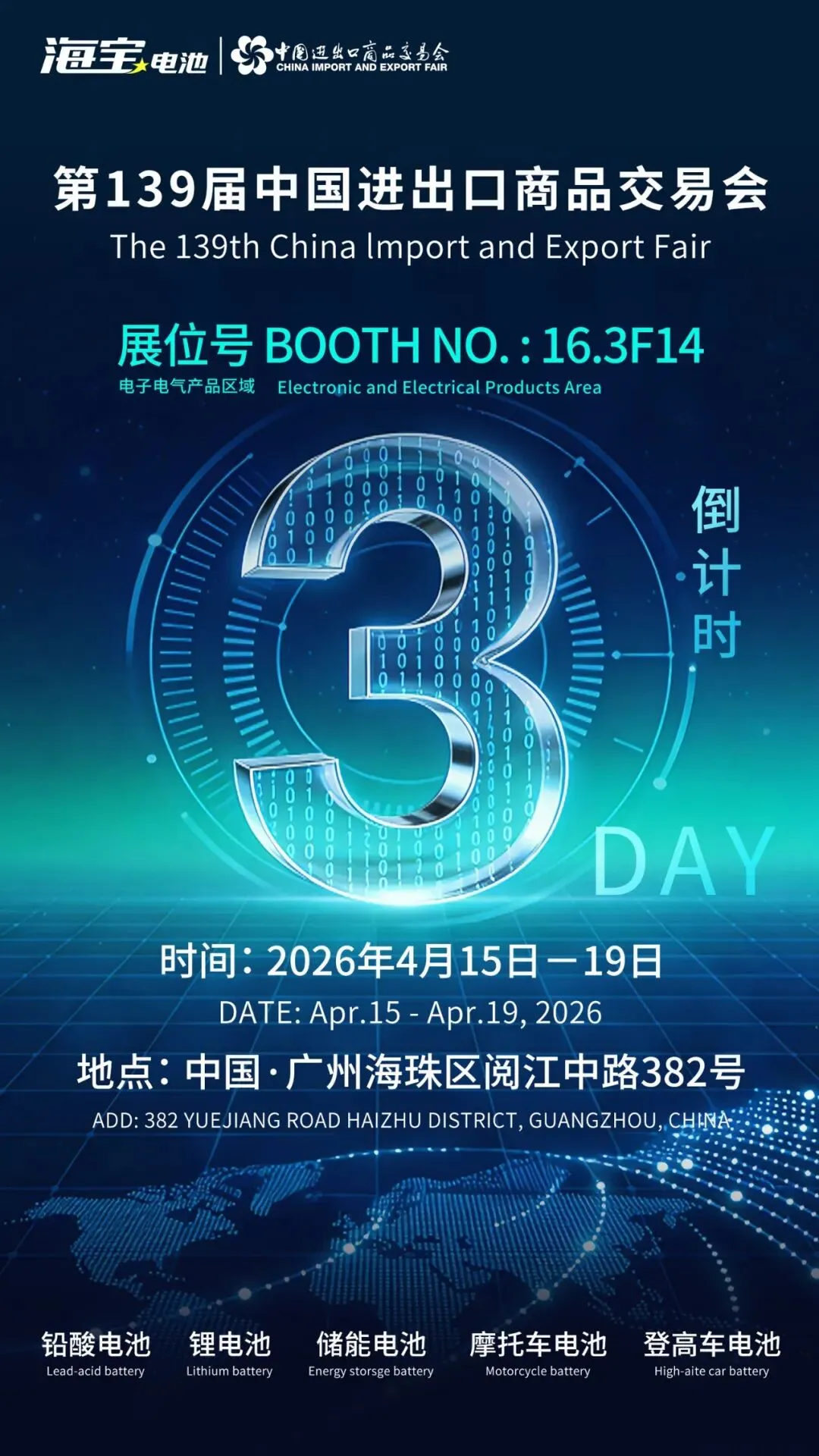 The Canton Fair will be held grandly from April 15 to 19, 2026, at the Canton Fair Complex.Haibao Battery's booth is located in:Electronic & Electrical Products Zone, Booth 16.3F14