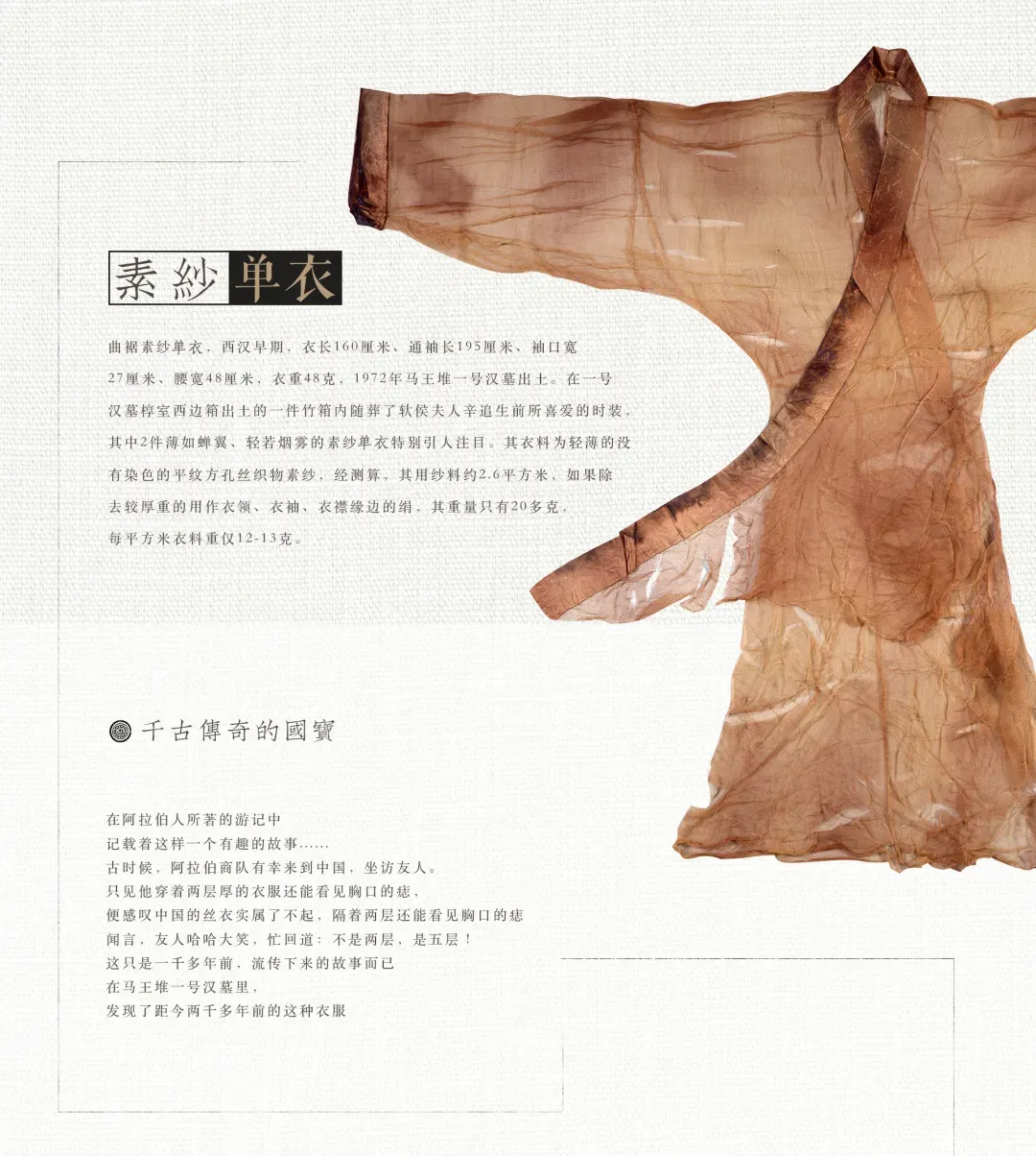 素纱单衣见证了西汉贵族对精致工艺的追求,承载了古代匠人巧夺天工的智慧,亦在千年之后,向世人诉说着中华丝绸文明的辉煌篇章。今日观之,其形制宛然,神韵依旧——那是两千年前的一缕丝线,穿越岁月,依然轻盈如初。