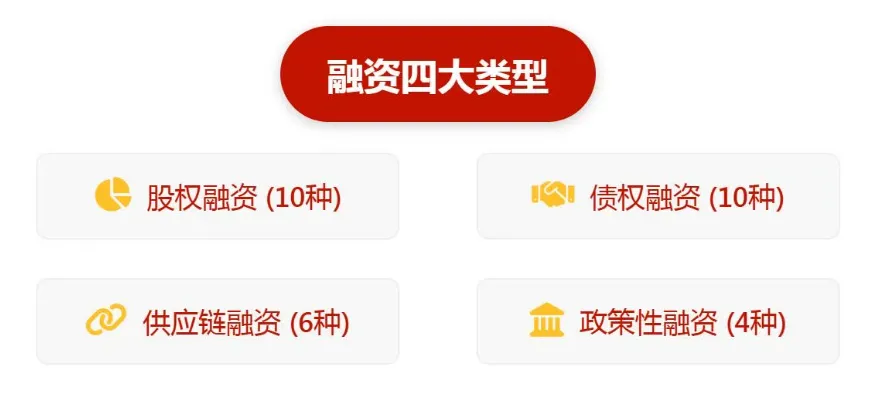 企业融资根据资金属性、来源可分为股权融资、债权融资、政策性融资、供应链/经营性融资四大类,共覆盖30种主流融资方式,适配企业从初创到成熟的全生命周期需求。