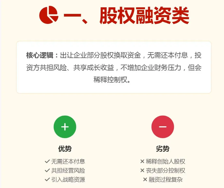 核心逻辑:出让企业部分股权换取资金,无需还本付息,投资方共担风险、共享成长收益,不增加企业财务压力,但会稀释控制权。