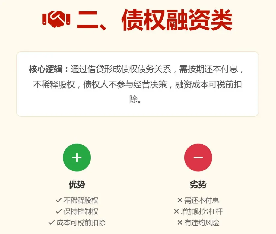核心逻辑:通过借贷形成债权债务关系,需按期还本付息,不稀释股权,债权人不参与经营决策,融资成本可税前扣除。