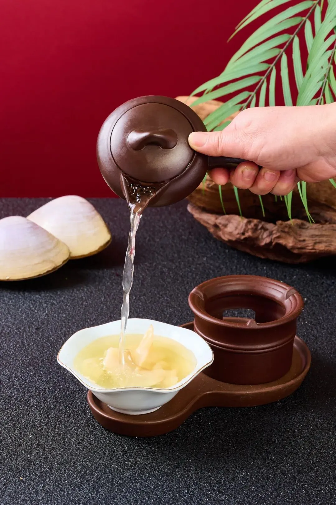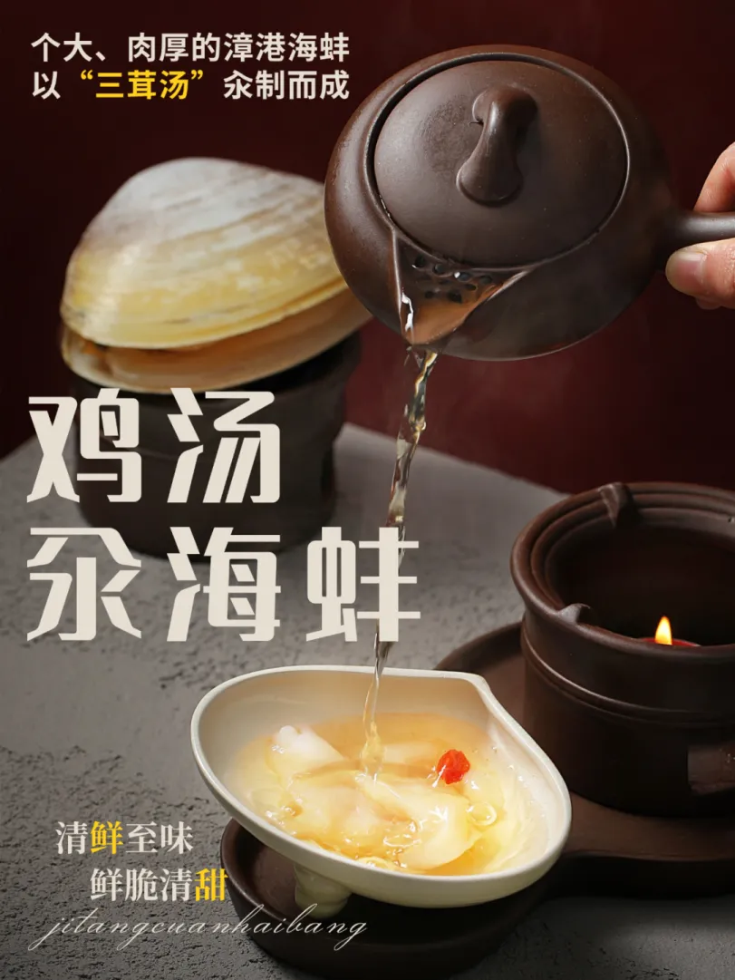 在这份菜单中,鸡汤汆海蚌往往作为“头汤”或“闽味第一道”出场。它以绝对的“清”与“鲜”,瞬间唤醒味蕾,为后续的珍馐拉开序幕。