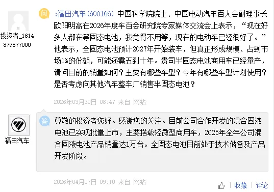 4月7日,福田汽车在互动平台回答投资者提问时表示,目前公司合作开发的混合固液电池已实现批量上市,主要搭载轻微型商用车,2025年全年公司混合固液电池产品销量达1万台。全固态电池目前处于技术储备及产品开发阶段。这款混合固液电池主要搭载于福田祥菱Q、祥菱U7等轻微型商用车,以及卡文乐福等新能源面包车。