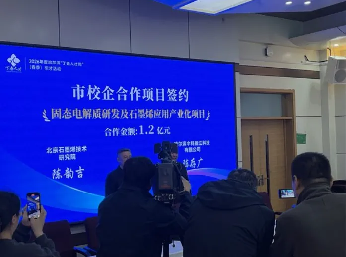 近日,北京石墨烯技术研究院与哈尔滨中科盈江科技公司签约,将在哈尔滨投资建设固态电解质研发及石墨烯应用产业化项目。项目合作金额1.2亿元,可为新能源动力电池、储能装备等产业发展提供核心材料支撑,填补哈尔滨在高端固态电解质材料领域的产业化空白。