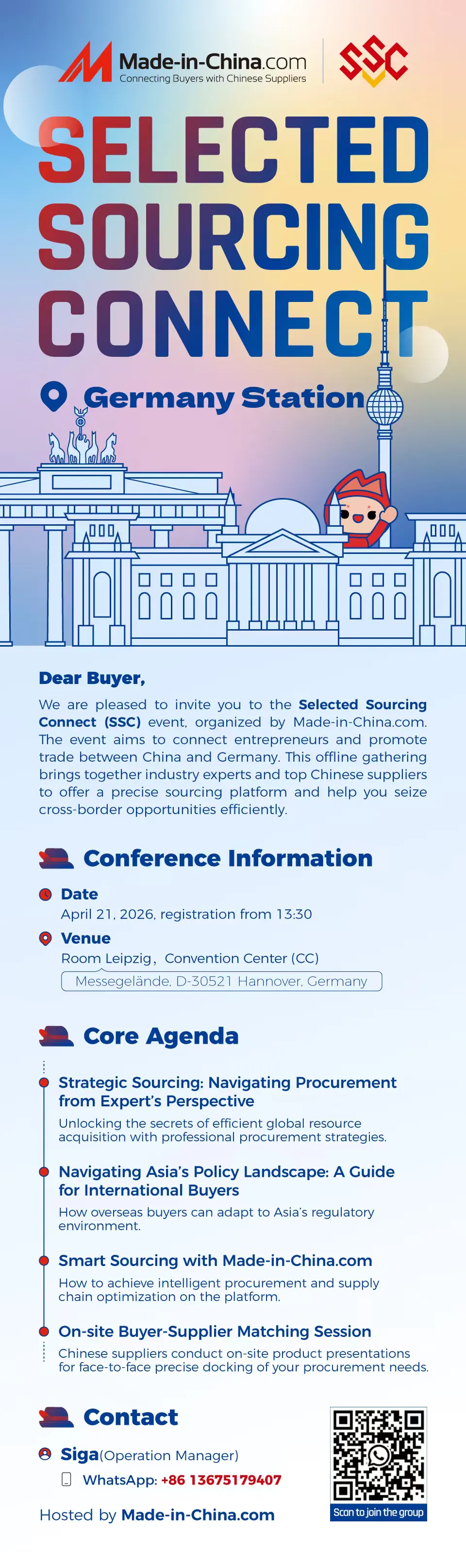 2026年4月21日中国制造网将在德国汉诺威会展中心的莱比锡厅举办题为“连接全球买家与中国优质供应商”的线下B2B采购对接会。