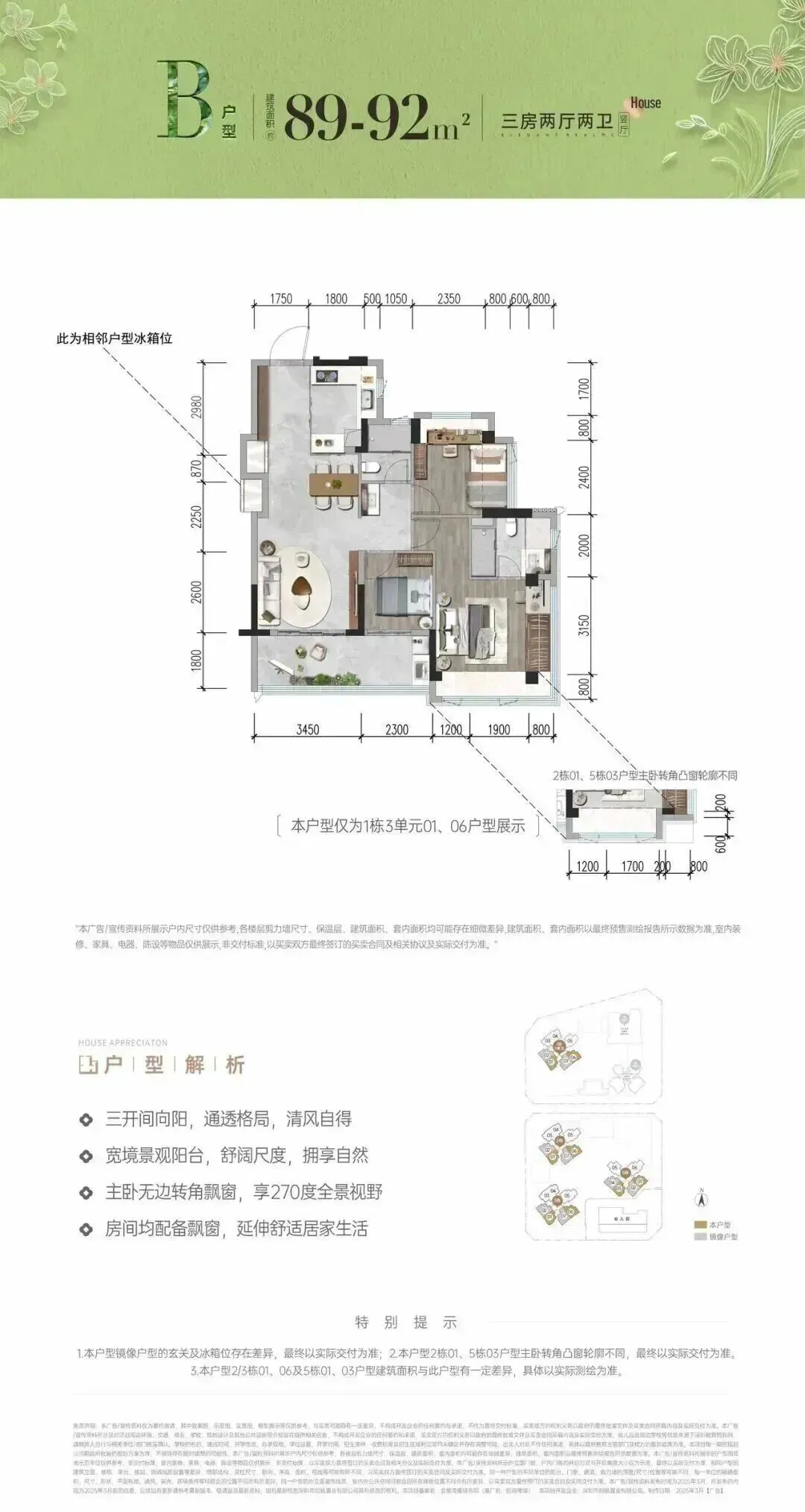 招商会展湾雍境名邸位于宝安沙井大前海会展湾片区的招商会展湾雍境名邸于2025年4月30日取证入市,本次是招商会展湾雍境二期,首推1栋3单元的195套房源,面积段有80㎡3房1卫,91㎡3房2卫,92㎡3房2卫3种户型,是3梯7户的普通高层,预计2027年9月精装交楼。
