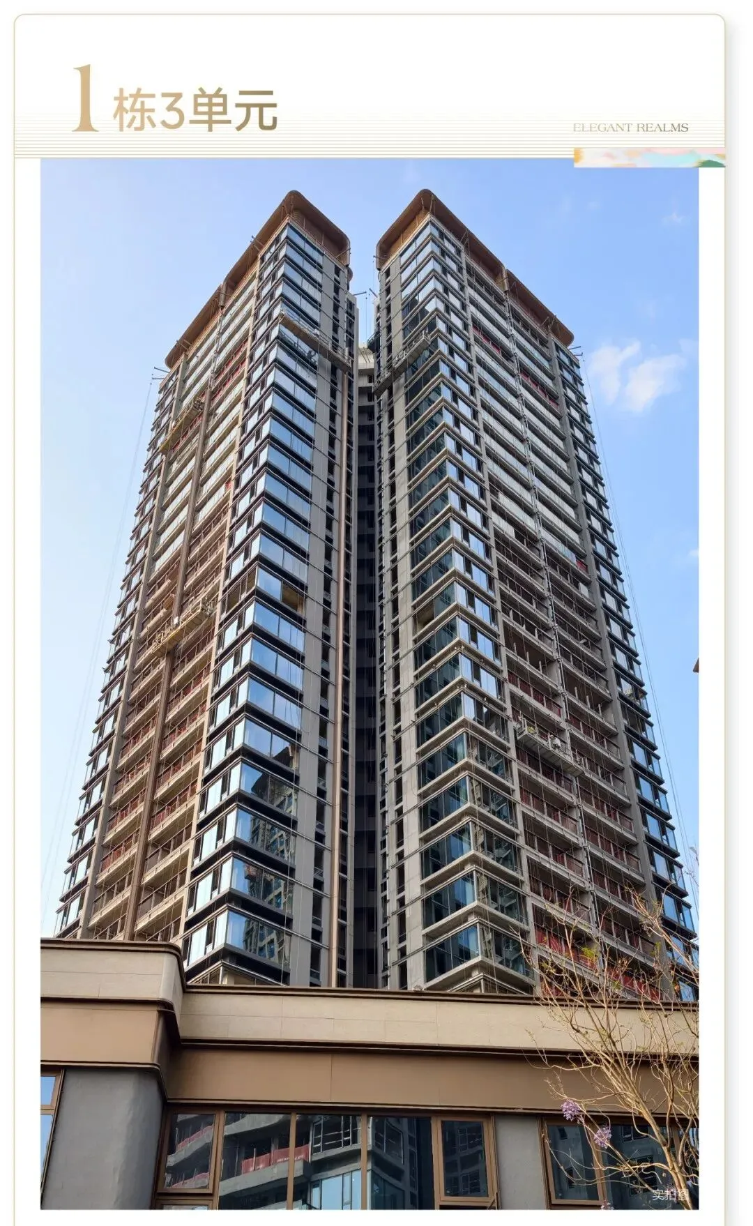 据说招商会展湾雍境名邸的项目外立面,光是铝板+玻璃的占比就约70%,还采用了栅格、石板等材料为装饰,外观极简大气,造价高昂。