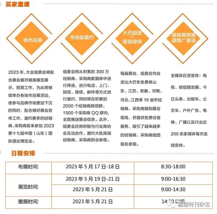 1、市场宣传启动,精准邀约高品质观众:本届展会市场宣传、招观工作已全面开启,除在网上进行大量推广外,还配合线下地推活动、上门拜访邀约等方式,同时各地市巡展推广工作也在积极准备中。此外,组委会还将继续优化专业观众参会接待服务工作,届时将为展会带来更多高品质专业观众。2、服务更全面,多形式助力厂商宣传:大会组委会十分重视对展商的增值服务工作,在非参展时间,组委会通过大会官方网站、微信小程序、微信公众号、微信群、微博、H5以及旗下网易号、搜狐号、互动吧、今日头条等多达几十个自私域流量媒体账号,积极帮助厂家进行宣传推广,以帮助企业寻找客户,获得成交。3、现场活动多样,保障良好参会体验:本届展会现场除举办行业发展论坛、颁奖典礼外,还将配套形式多样的互动活动,为展商、专业观众带来良好的参会体验。4、展会品质严格把控,打造良好参展环境:在本届展会上,大会组委会将严格把控参展品牌准入机制,保障良好参会体验。流通领域:经销商、代理商、批发贸易商、零售商、网商等。进口经销:国内各省市的进口酒类经销商、采购商、商超、进口超市等。餐饮领域:各种大中小型星级酒店饭店、中高档餐饮连锁机构、中西餐厅等。团购渠道:全国各省市机关单位、大型商业集团、商业综合体、高校、企事业单位等。协会媒体:各省市行业主管单位、商协会、媒介媒体等。