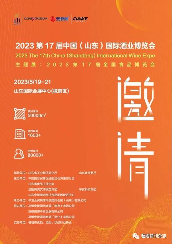 2023第17届中国(山东)国际酒业博览会将于5月19日盛大开幕!届时《糖酒特刊》杂志将在3C68展位恭候各地伙伴们前来交流!中国(山东)国际酒业博览会是酒类行业定位于B2B的专业盛会,是酒类行业举办历史较早、规模较大的盛会之一,是通过全球展览业协会(UFI)认证的国际知名品牌展会,荣获“改革开放40周年中国品牌展会金奖”等二十余项荣誉称号,并被山东省商务厅认定为“山东省品牌展会”。中国(山东)国际酒业博览会立足山东这一全国酒类行业生产、消费大省,面向全国展示酒类行业风采。中国(山东)国际酒业博览会迄今已成功举办十六届,累计展出面积超过59万平方米,累计参展企业数达到24400余家,共计组织、吸引专业观众86万余人次,累计成交总额237亿元,并成功举办高峰论坛、主题活动等120余场次。为促进我国酒类行业的发展做出了应有的贡献。