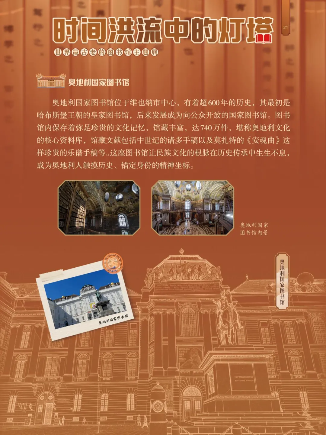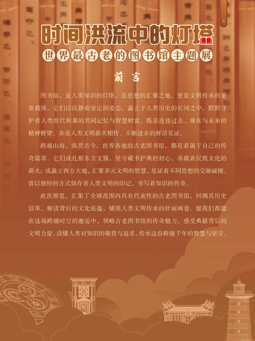 此次展览,汇集了全球范围内具有代表性的古老图书馆,回溯其历史沿革,解读背后的文化底蕴,铺展人类文明传承的壮丽画卷。愿我们都能在这场跨越时空的邂逅中,领略古老图书馆的传奇魅力,感受典籍背后的文明力量,读懂人类对知识的敬畏与追求,传承这份跨越千年的智慧与坚守。