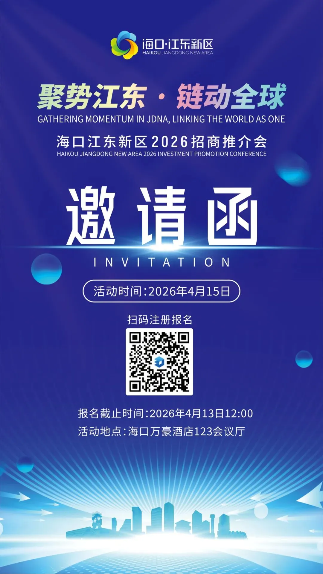 为助力海口高标准建设海南自由贸易港核心引领区和“六个之城”,借力消博会全球平台,“聚势江东・链动全球” 海口江东新区2026招商推介会将于2026年4月15日在海口万豪酒店举办,诚挚邀请全国优质企业、金融机构、专家学者与产业精英齐聚椰城,全方位感受江东新区发展势能、政策优势与投资热土魅力,共商合作、共拓商机、共赢未来。