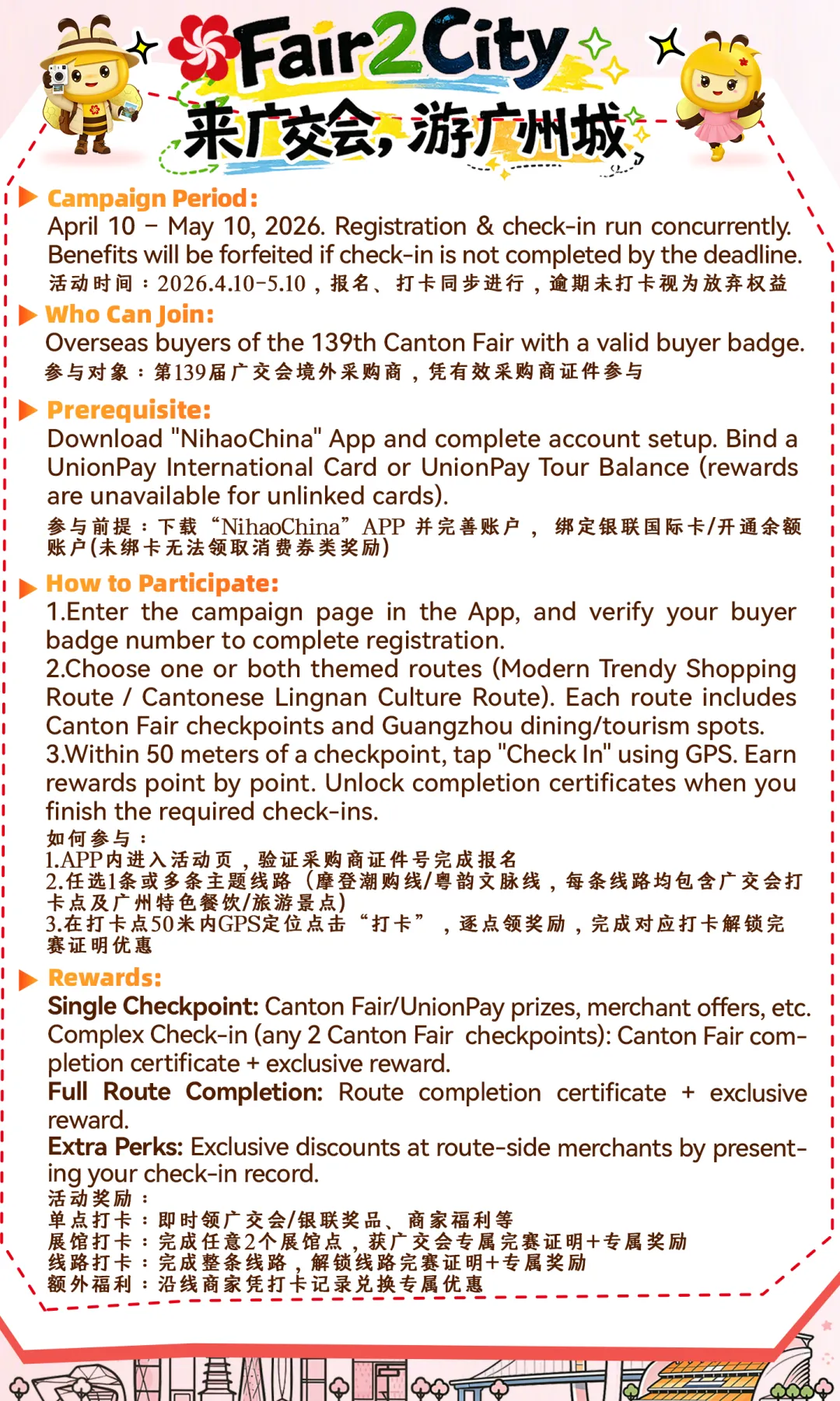 本次展会同步开启「Fair2City 来广交会,游广州城」活动(4.10-5.10),境外采购商可通过 Nihao China APP 打卡广交会展馆、广州塔、永庆坊等点位,领取专属福利。这意味着采购商在穗停留时间更长,参展商的洽谈机会直接翻倍!