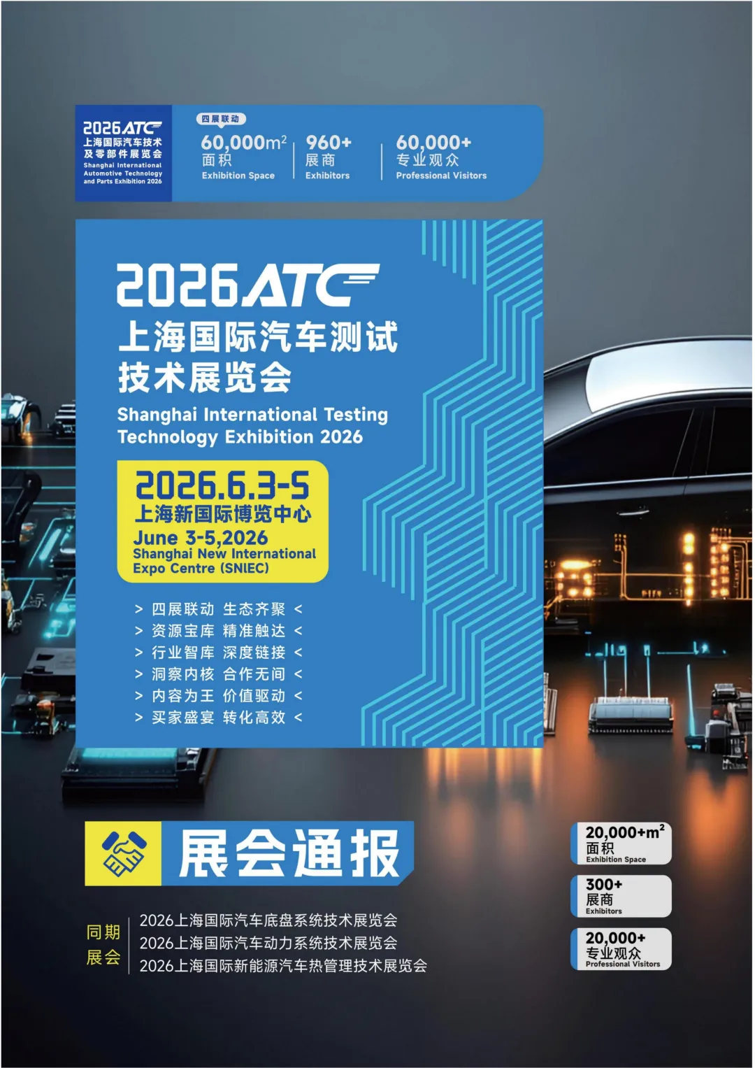 汽车智能化与电动化深度推进,整车验证周期持续压缩,企业普遍面临精准获客成本高、核心技术对接不畅、产业链资源整合效率不足等现实困境。当前汽车产业转型加速,测试技术作为产品安全与性能的核心保障,已成为车企与供应链企业竞争的关键环节。但行业普遍存在:精准触达主机厂及 T1 供应商决策层难度加大、前沿技术信息获取滞后、线下高效交流场景缺失、优质技术与市场需求匹配度不足等问题,制约企业技术落地与市场拓展。2026 ATC 上海国际汽车测试技术展览会,作为亚洲极具影响力的汽车测试领域专业展会,将于 6 月 3—5 日在上海新国际博览中心 举办。展会聚焦汽车测试全产业链,汇聚全球前沿技术与优质资源,构建集技术交流、产业对接、趋势洞察于一体的专业平台,为行业高质量发展提供高效支撑。- 精准对接产业资源:覆盖 60 万 + 行业数据,聚合整车厂技术人员、核心零部件企业、测试设备与服务商,高效链接高价值采购方与技术合作方;