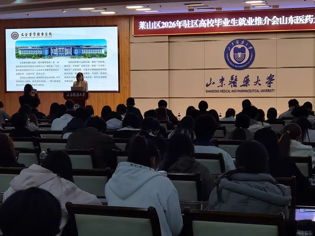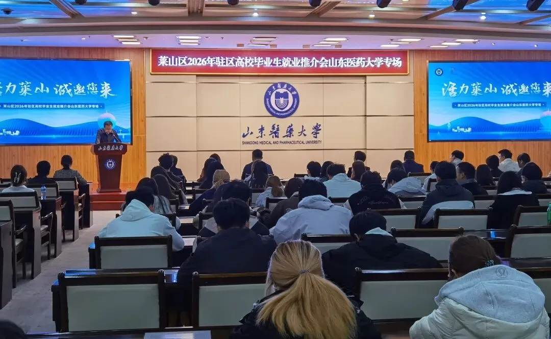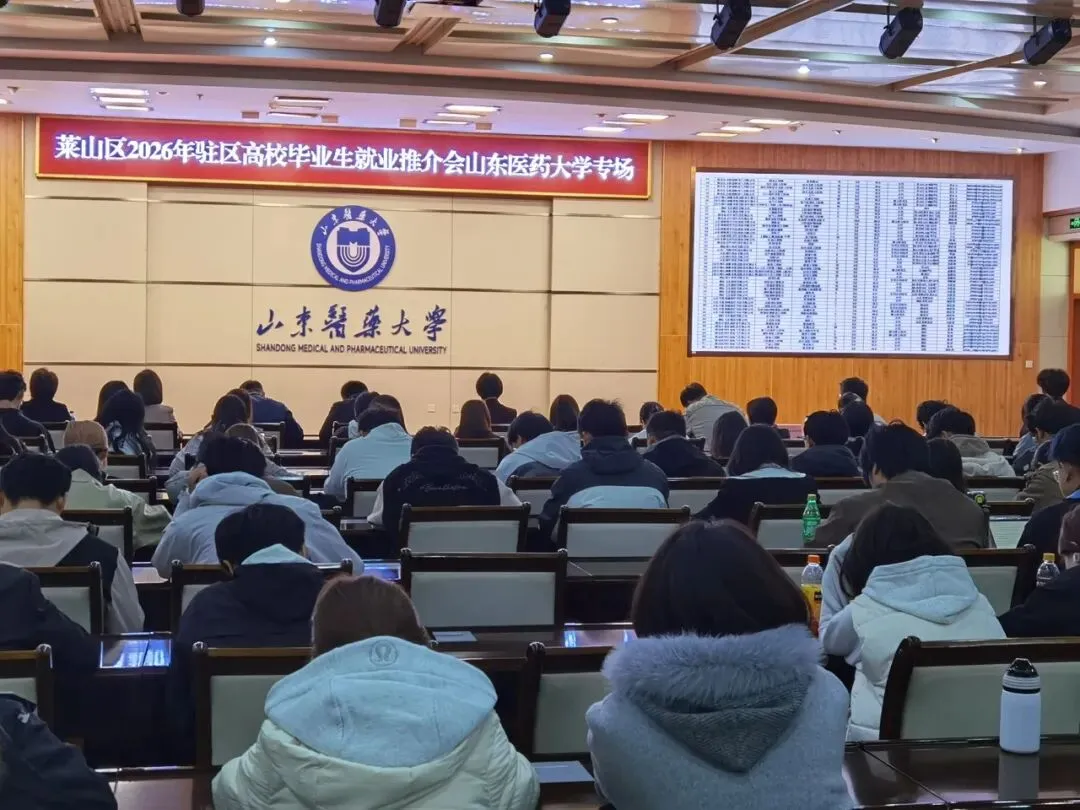 4月11日上午,莱山区2026年驻区高校毕业生就业推介会山东医药大学专场在学校图书馆六楼报告厅举行。