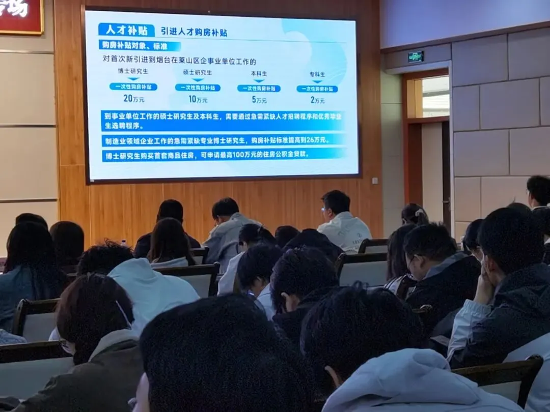 上午10点,推介会正式开始。山东医药大学领导致欢迎辞后,莱山区相关领导围绕区域发展情况作了介绍,从产业基础到生活配套,逐一展开。随后,莱山区人社部门主要领导现场发布人才需求榜单,明确了当前重点岗位的缺口方向。莱山区人社部门相关负责人就青年人才政策进行了解读,内容涵盖住房补贴、创业扶持等具体措施。优秀校友代表结合自身经历,分享了留莱就业的真实感受,并有多家企业依次上台,就岗位需求、薪资待遇、发展空间作了推介。
