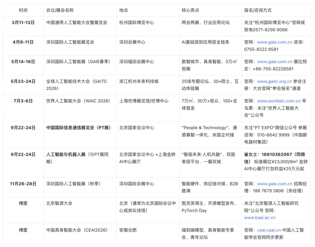 以下是2026年国内主要AI展会及峰会的具体信息,建议收藏并提前锁定早鸟权益:建议 :9月北京双展(PT展+人工智能与机器人展)是2026年唯一实现"国家级通信展+国家级AI展"同馆联动的项目,适合需要同时对接运营商、央企、政府部委的AI企业,建议通过上述联系方式尽早锁定展位(热门展馆位置紧张)。