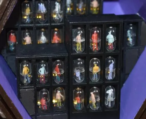 作品以模拟高楼的作品形式,每一个格子代表着一个独居的青年。以在透明胶囊里的单独青年,喻示着“孤独”的精神情绪。