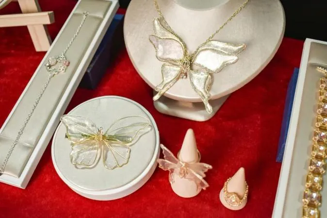 A:蝴蝶,是西方神话里的蜕变与重生,更是梁祝追求爱与自由的祝福。我们以此为灵感,提取了蝴蝶的造型,与鎏金的光泽相结合,温柔中又带着一丝自由的灵动,表达肉虫破茧而出变作蝴蝶的自由和美丽,也象征着脱离困境,重获新生,表现了对至善至美的追求。其中我们包钻的一套饰品就更能体现出女性要勇于散发出自己的光亮,像蝴蝶一般活得出彩,活出自我。