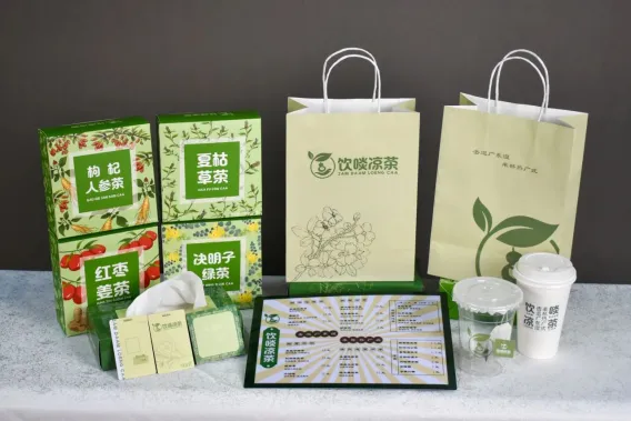 A:我们有参考类似于喜茶那种实体店的形象设计,在一个饮品店里面用肯定要有的就是杯子啊打包袋这些。然后我们还考虑到茶包这种产品,这就可供顾客带走回去自己制作。