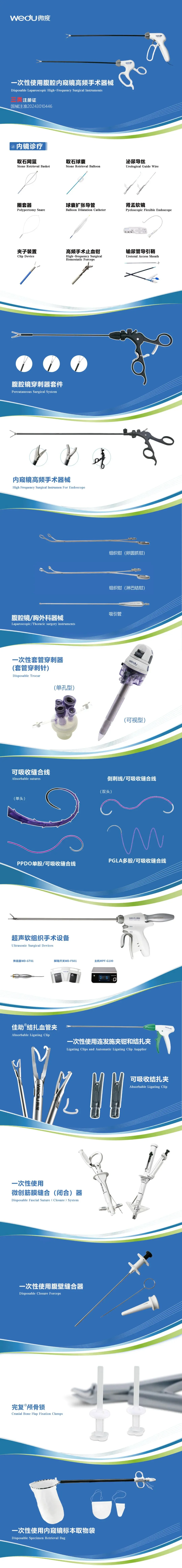 一次性使用腹腔镜内窥镜高频手术器械、内镜诊疗器械、腹腔镜穿刺器套件、内窥镜高频手术器械、腹腔镜/胸外科手术器械等多个创新型设备和综合性解决方案。