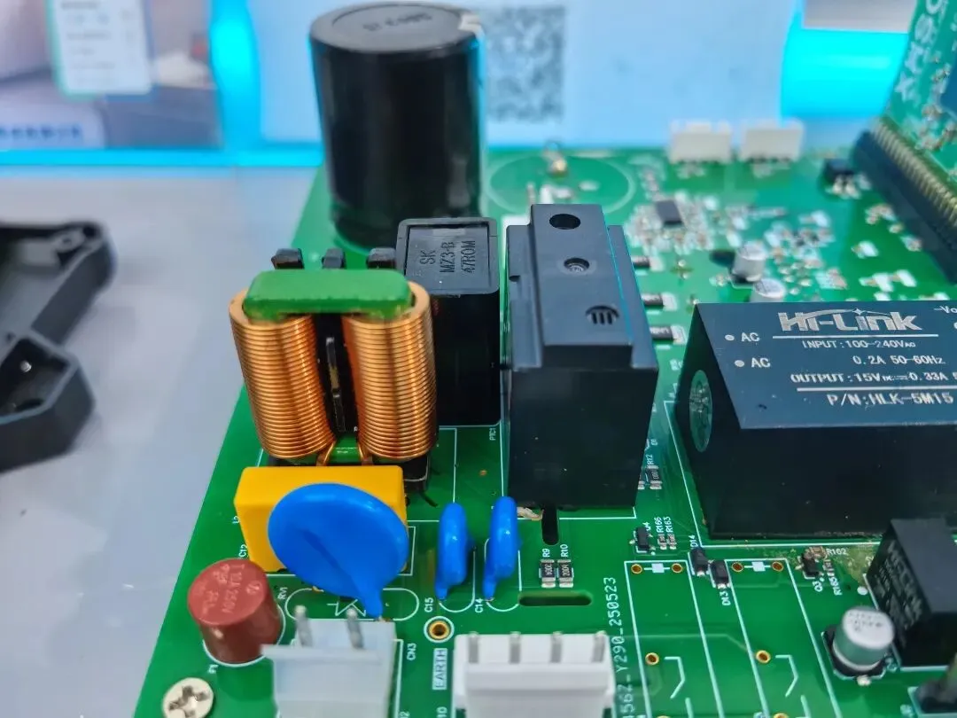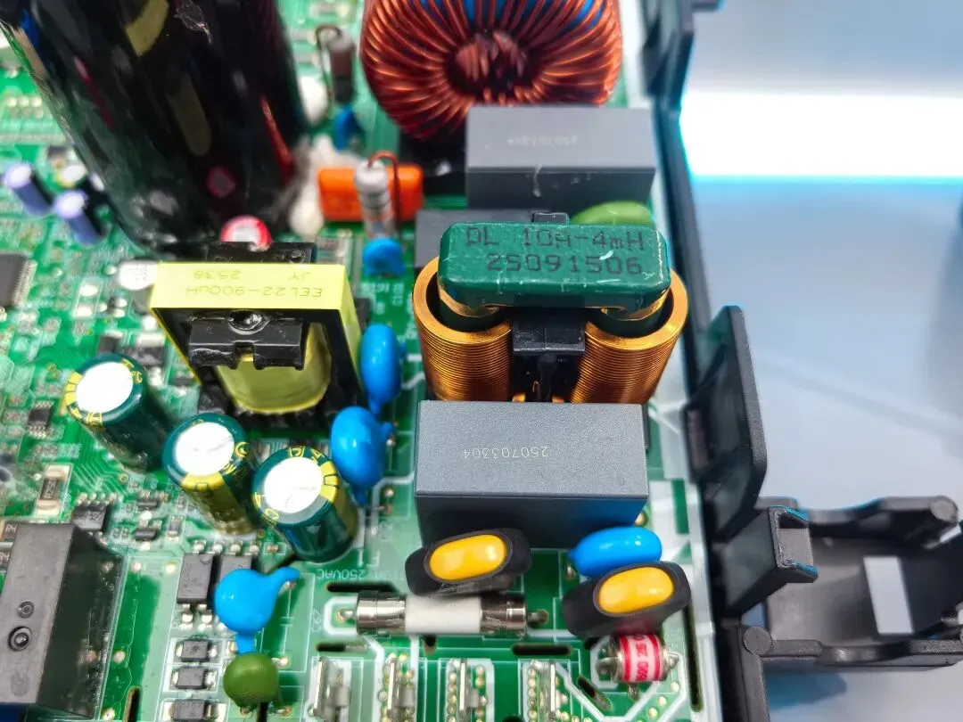 在展出的8块集成电路板中,我们发现了这类扁平线方形环的共模电感器应用很广。其中图示中的电感标示是“DL 10A-4mH 25091506”。